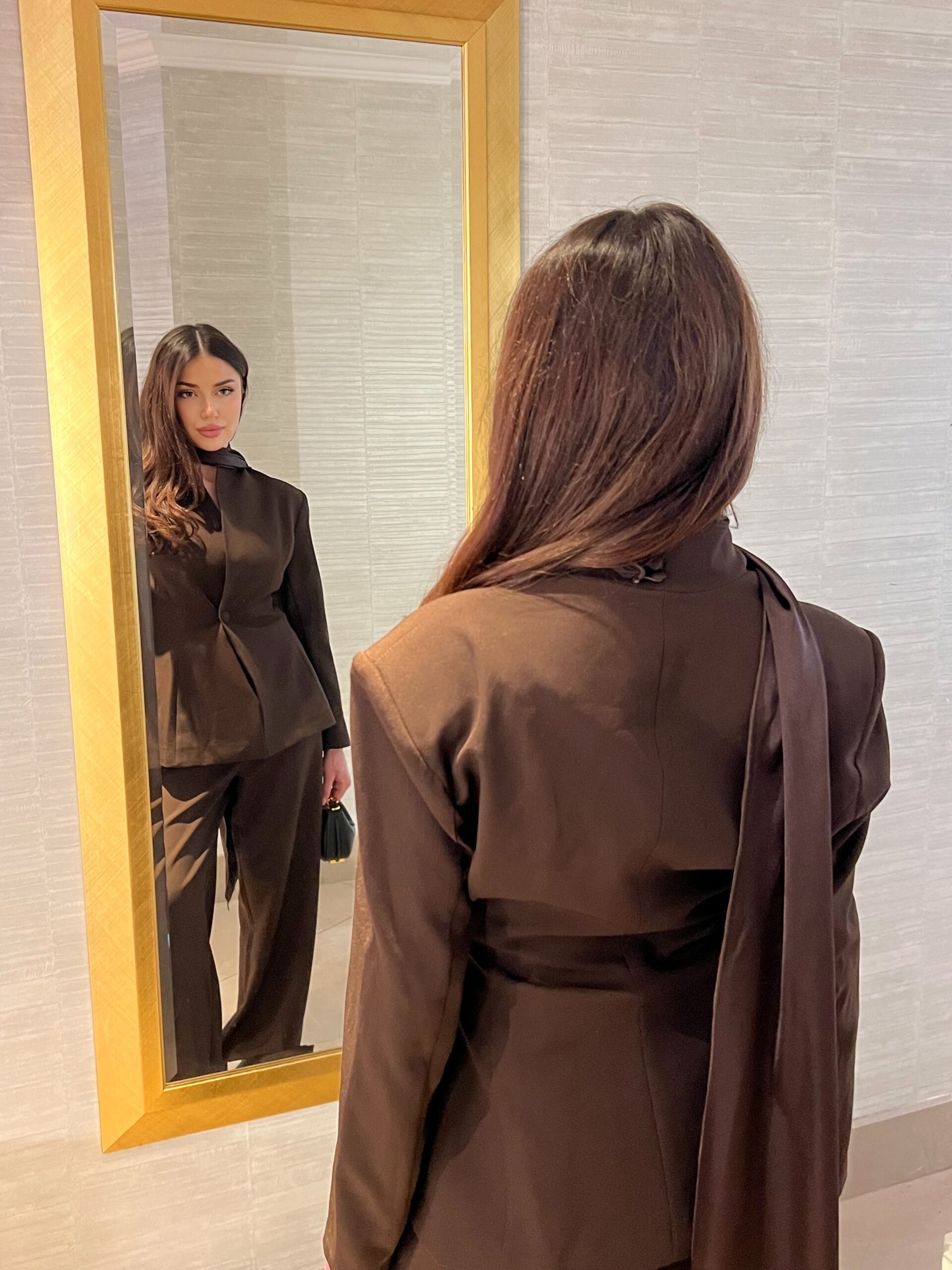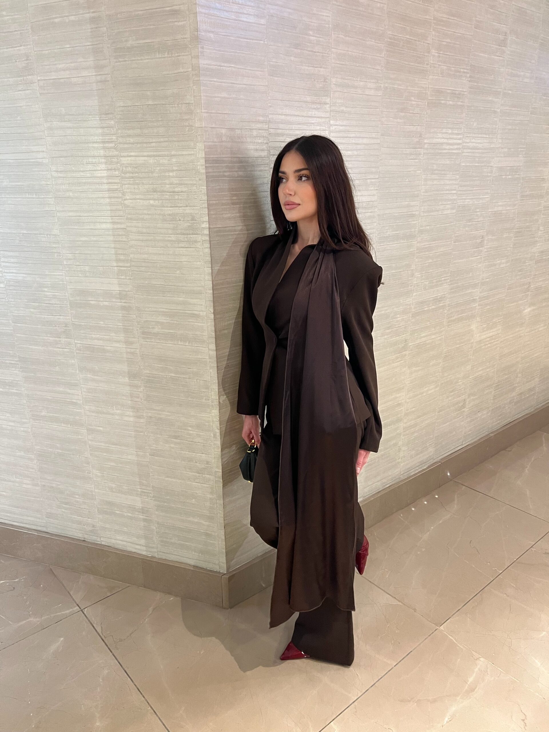 A beautiful, deep brown formal jacket with a unique detachable satin drape. Matching trousers with a belt which can also be paired with numerous different tops or jumpers.