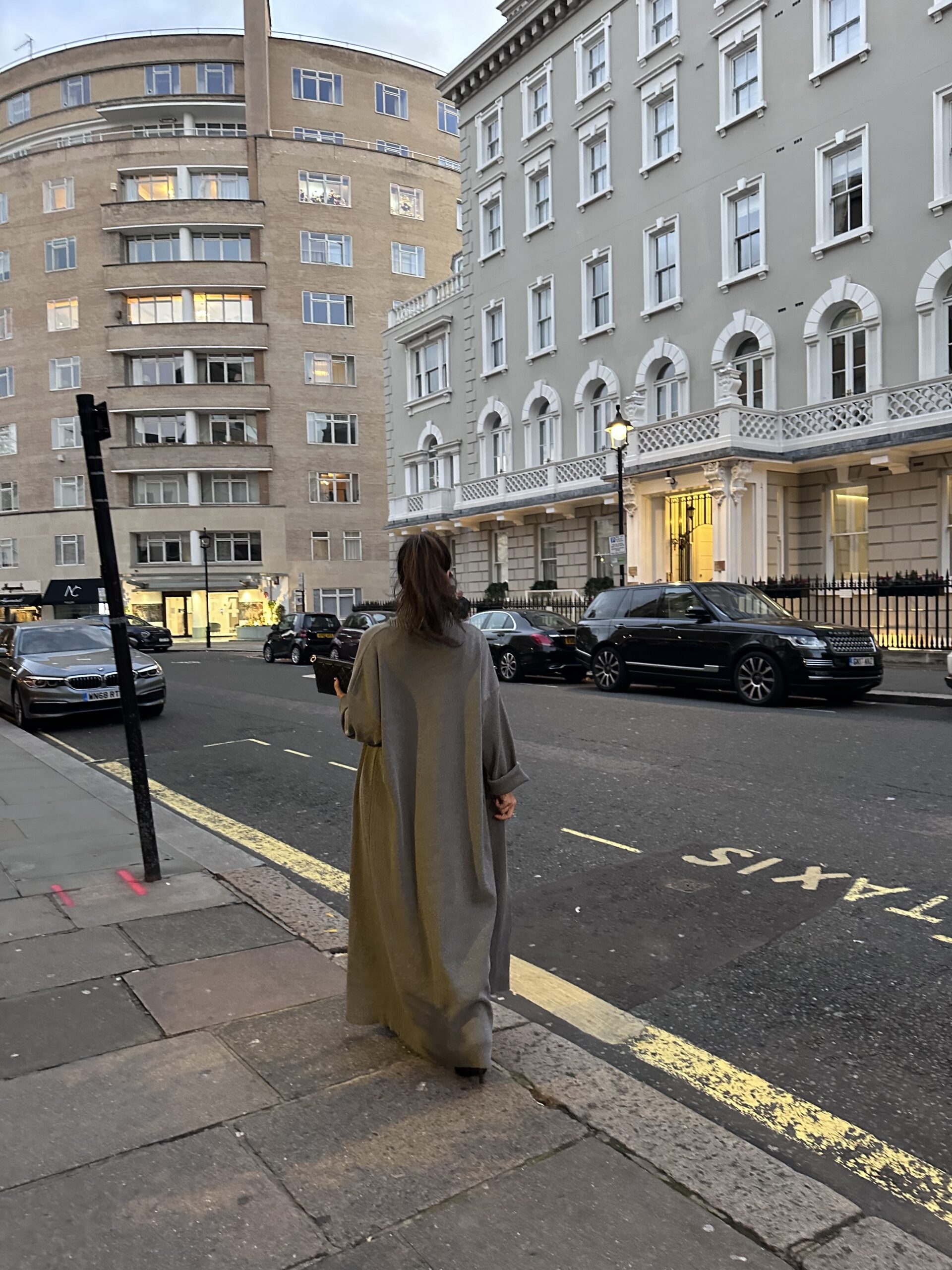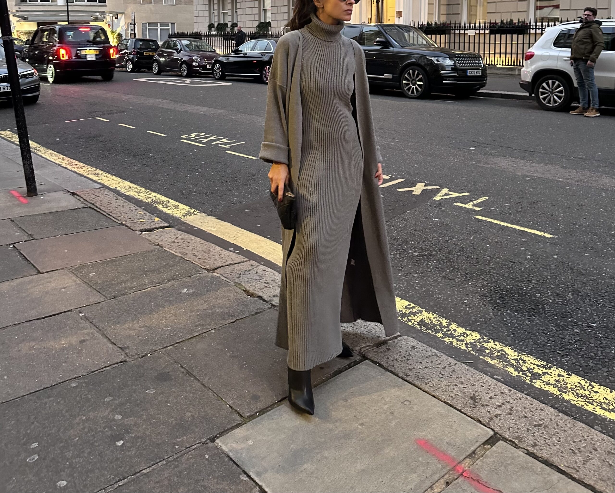 A modest long knit grey sleeveless polo neck dress, layered with a matching long open cardigan with long sleeves.