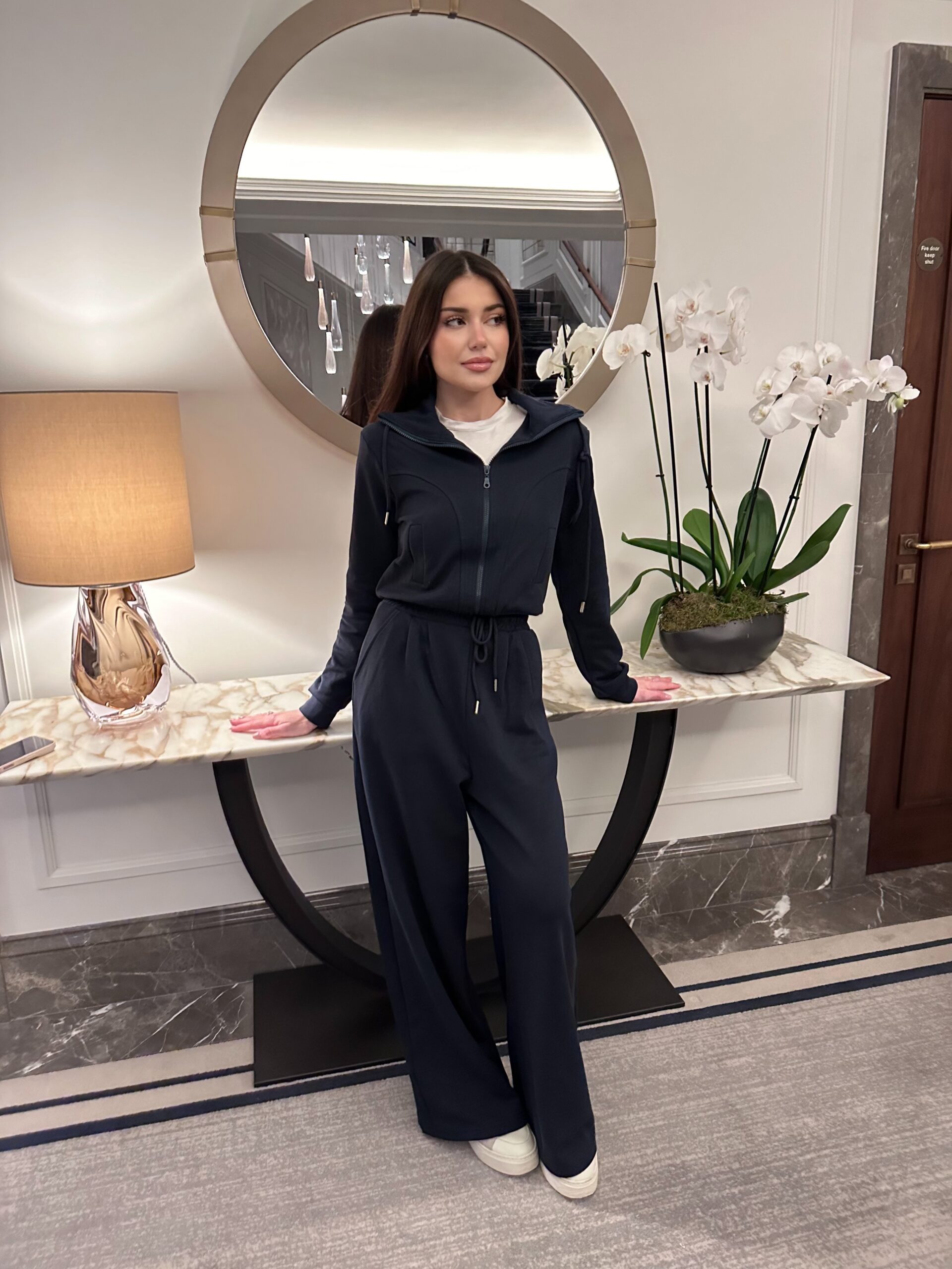 Navy blue tracksuit set. Fitted short zip up top with drawstrings. Pockets on each side.