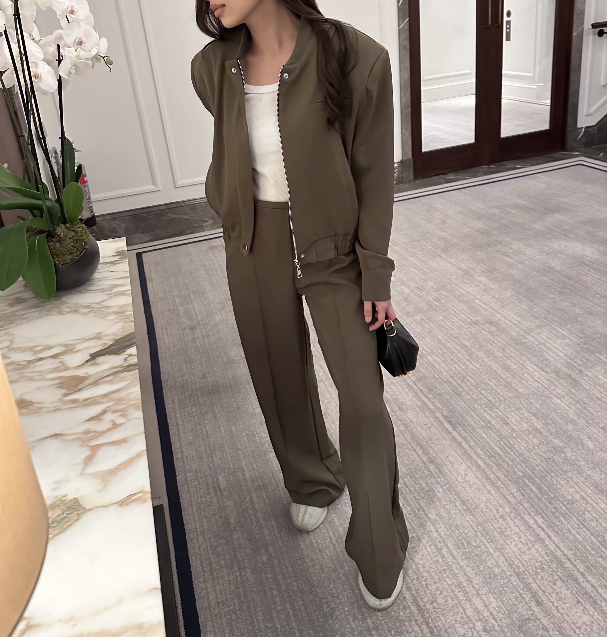 Olive coloured dressy straight, wide leg trouser and matching zip up top set.