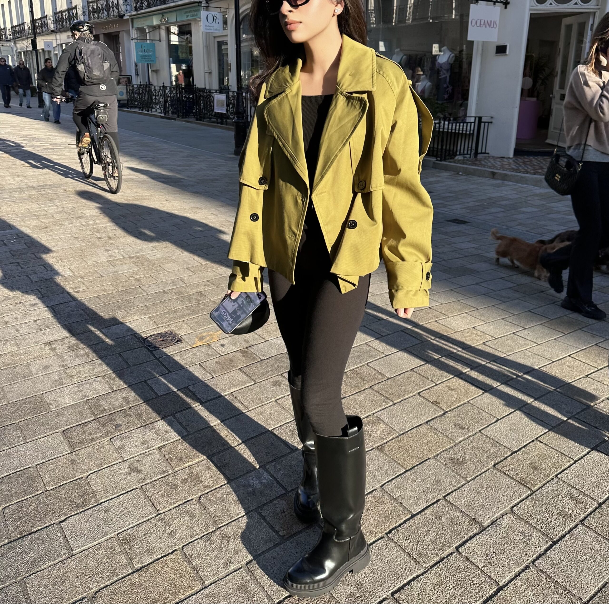 Lime coloured short trench jacket with button detailing on the sides and sleeves.