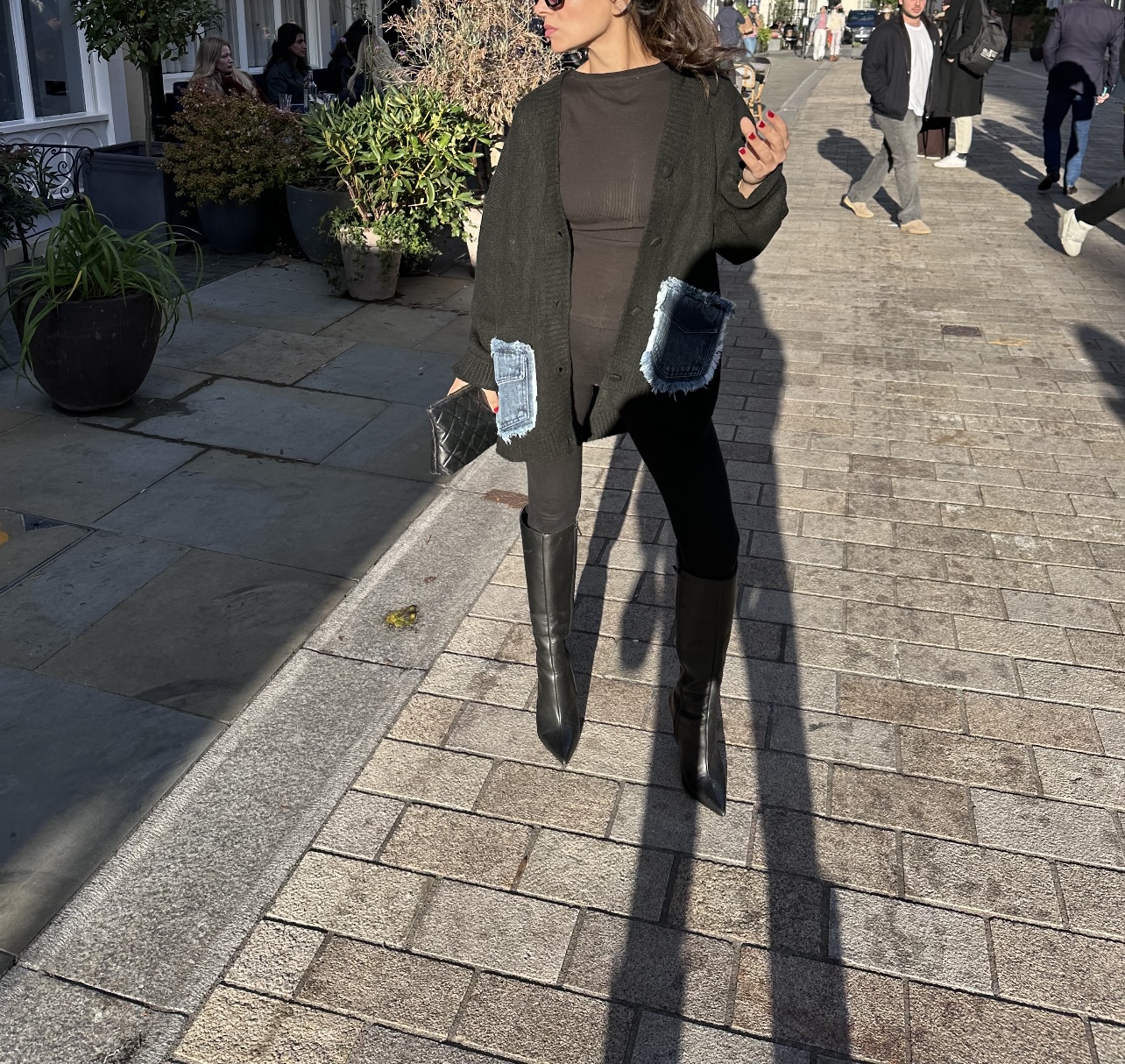 Oversized black knit cardigan detailed with Demim pockets and black buttons