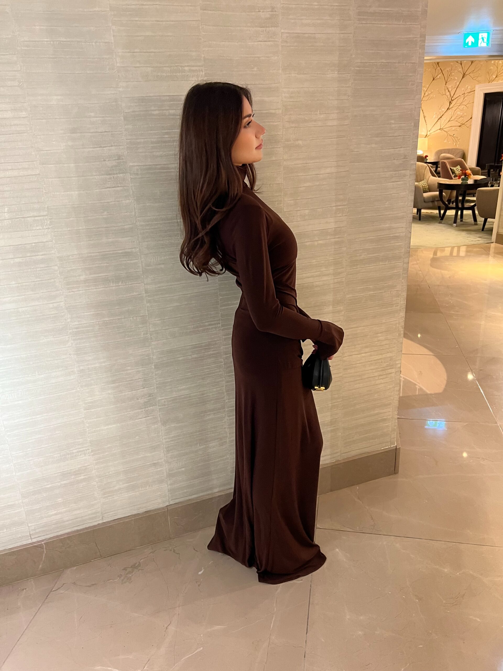 Beautiful wine coloured, long full sleeve, fitted, high neck modest dress, with a short drape from the hip.